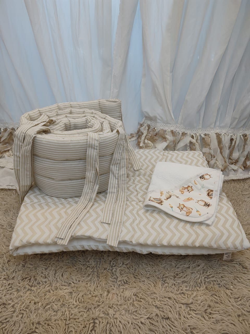 Este set incluye acolchado, chichonera y toallón con capucha, todo en una única estampa disponible, súper tierna y delicada, ideal para lograr una habitación armoniosa y práctica.